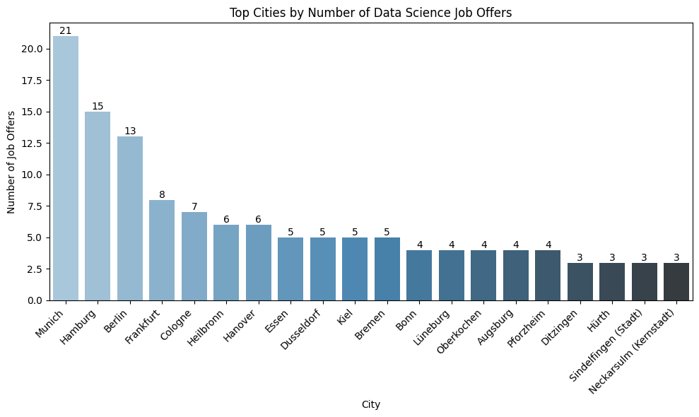 - A bar plot highlighting the top cities with the most data science job offers.