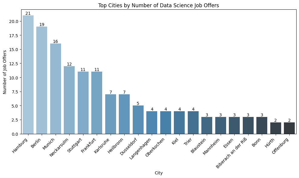 - A bar plot highlighting the top cities with the most data science job offers.