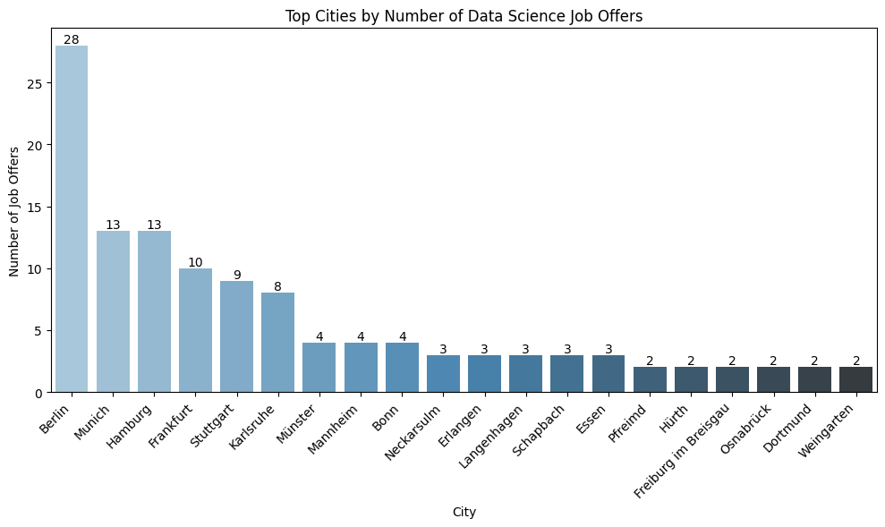 - A bar plot highlighting the top cities with the most data science job offers.