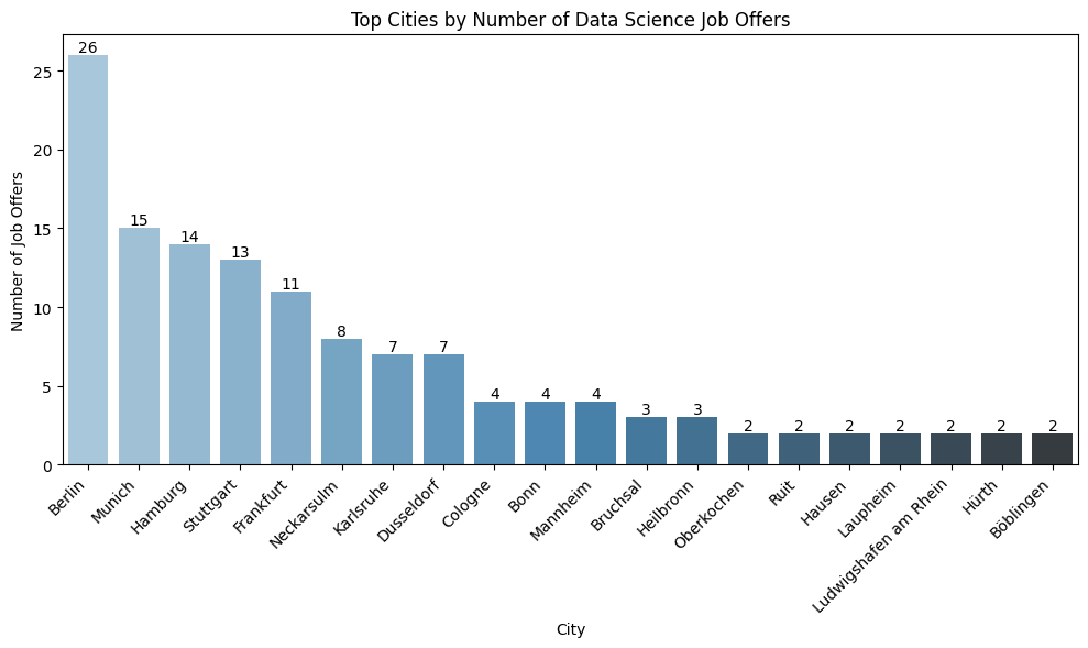 - A bar plot highlighting the top cities with the most data science job offers.
