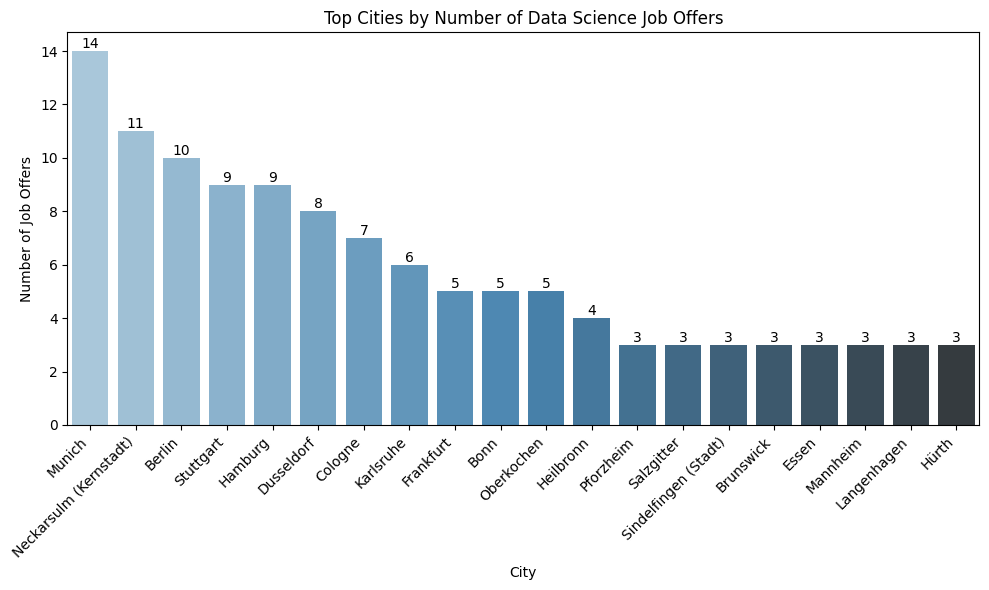 ## Top 20 Cities for Job Offerstop_cities = df_coords["city"].value_counts().head(20).reset_index() # get top 20top_cities.columns = ["city", "count"]plt.figure(figsize=(10, 6))ax = sns.barplot(data=top_cities, x="city", y="count", palette="Blues_d", hue="city", legend=False)# Add annotationsfor i, row in top_cities.iterrows(): ax.text(i, row["count"], str(row["count"]), ha='center', va='bottom', fontsize=10)plt.title("Top Cities by Number of Data Science Job Offers")plt.xticks(rotation=45, ha="right")plt.xlabel("City")plt.ylabel("Number of Job Offers")plt.tight_layout()plt.tight_layout()# ✅ Save BEFORE showplt.savefig(f"{output_dir}/top_cities.png", bbox_inches='tight')# show#plt.show()