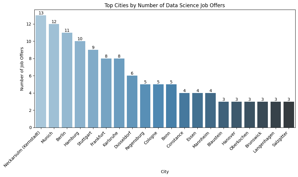 ## Top 20 Cities for Job Offerstop_cities = df_coords["city"].value_counts().head(20).reset_index() # get top 20top_cities.columns = ["city", "count"]plt.figure(figsize=(10, 6))ax = sns.barplot(data=top_cities, x="city", y="count", palette="Blues_d", hue="city", legend=False)# Add annotationsfor i, row in top_cities.iterrows(): ax.text(i, row["count"], str(row["count"]), ha='center', va='bottom', fontsize=10)plt.title("Top Cities by Number of Data Science Job Offers")plt.xticks(rotation=45, ha="right")plt.xlabel("City")plt.ylabel("Number of Job Offers")plt.tight_layout()plt.tight_layout()# ✅ Save BEFORE showplt.savefig(f"{output_dir}/top_cities.png", bbox_inches='tight')# show#plt.show()