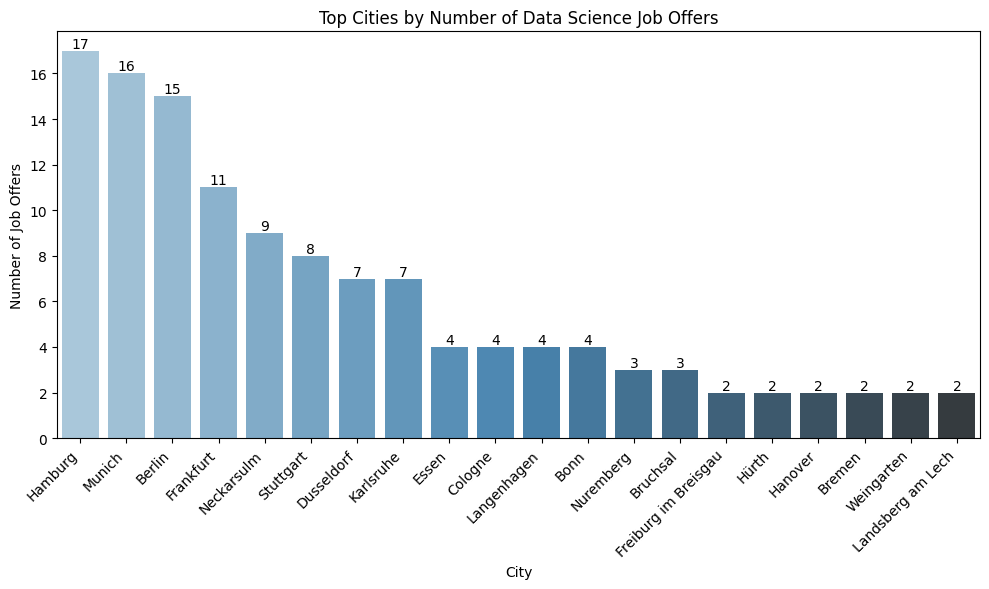 ## Top 20 Cities for Job Offerstop_cities = df_coords["city"].value_counts().head(20).reset_index() # get top 20top_cities.columns = ["city", "count"]plt.figure(figsize=(10, 6))ax = sns.barplot(data=top_cities, x="city", y="count", palette="Blues_d", hue="city", legend=False)# Add annotationsfor i, row in top_cities.iterrows(): ax.text(i, row["count"], str(row["count"]), ha='center', va='bottom', fontsize=10)plt.title("Top Cities by Number of Data Science Job Offers")plt.xticks(rotation=45, ha="right")plt.xlabel("City")plt.ylabel("Number of Job Offers")plt.tight_layout()plt.tight_layout()# ✅ Save BEFORE showplt.savefig(f"{output_dir}/top_cities.png", bbox_inches='tight')# show#plt.show()