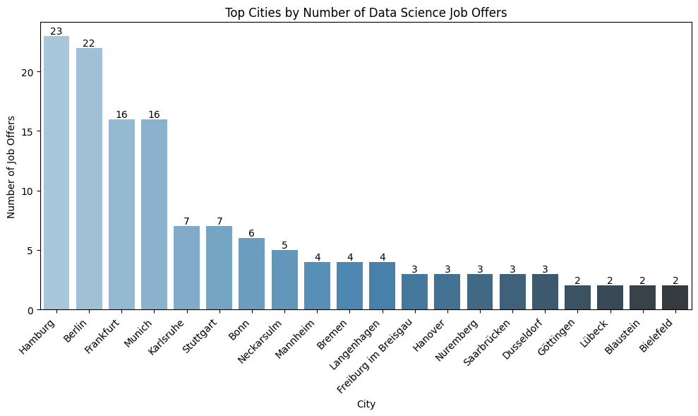 ## Top 20 Cities for Job Offerstop_cities = df_coords["city"].value_counts().head(20).reset_index() # get top 20top_cities.columns = ["city", "count"]plt.figure(figsize=(10, 6))ax = sns.barplot(data=top_cities, x="city", y="count", palette="Blues_d", hue="city", legend=False)# Add annotationsfor i, row in top_cities.iterrows(): ax.text(i, row["count"], str(row["count"]), ha='center', va='bottom', fontsize=10)plt.title("Top Cities by Number of Data Science Job Offers")plt.xticks(rotation=45, ha="right")plt.xlabel("City")plt.ylabel("Number of Job Offers")plt.tight_layout()plt.tight_layout()# ✅ Save BEFORE showplt.savefig(f"{output_dir}/top_cities.png", bbox_inches='tight')# show#plt.show()