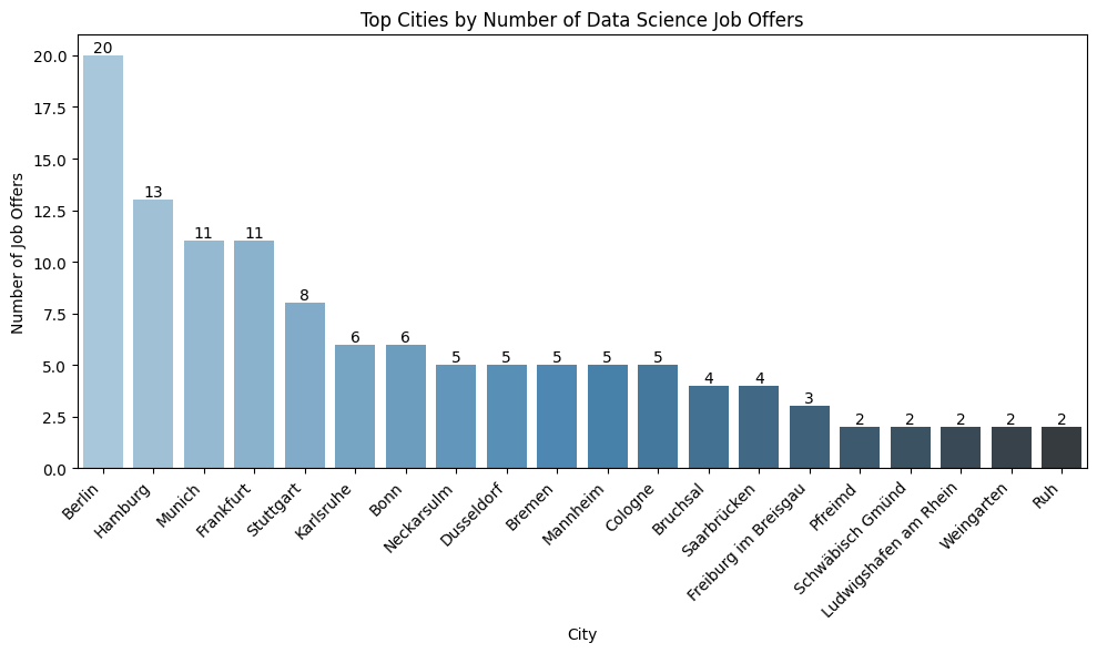 ## Top 20 Cities for Job Offerstop_cities = df_coords["city"].value_counts().head(20).reset_index() # get top 20top_cities.columns = ["city", "count"]plt.figure(figsize=(10, 6))ax = sns.barplot(data=top_cities, x="city", y="count", palette="Blues_d", hue="city", legend=False)# Add annotationsfor i, row in top_cities.iterrows(): ax.text(i, row["count"], str(row["count"]), ha='center', va='bottom', fontsize=10)plt.title("Top Cities by Number of Data Science Job Offers")plt.xticks(rotation=45, ha="right")plt.xlabel("City")plt.ylabel("Number of Job Offers")plt.tight_layout()plt.tight_layout()# ✅ Save BEFORE showplt.savefig(f"{output_dir}/top_cities.png", bbox_inches='tight')# show#plt.show()