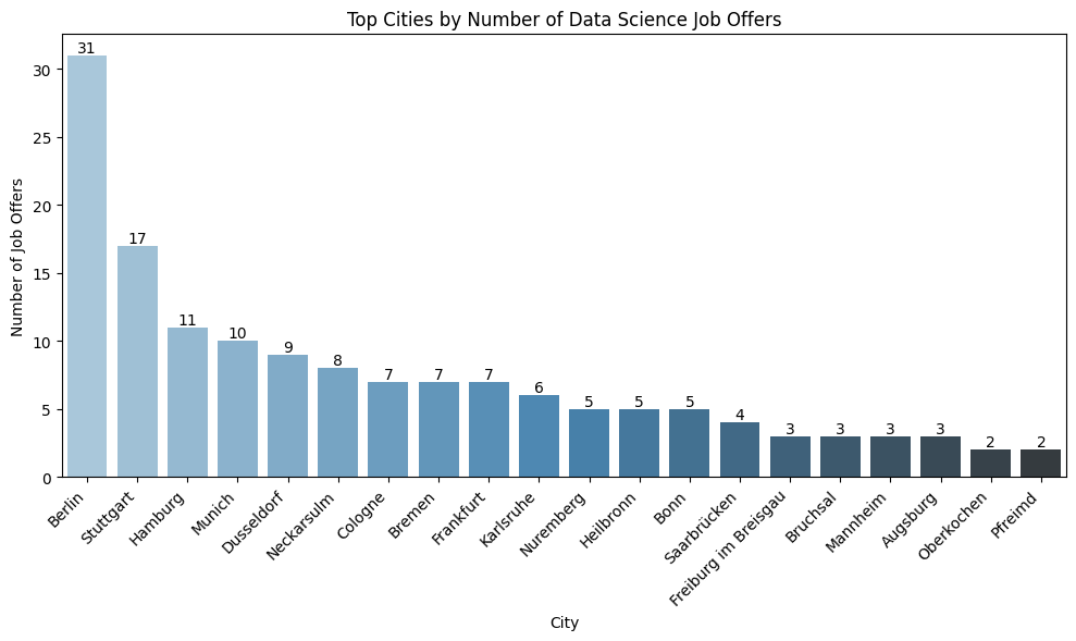 ## Top 20 Cities for Job Offerstop_cities = df_coords["city"].value_counts().head(20).reset_index() # get top 20top_cities.columns = ["city", "count"]plt.figure(figsize=(10, 6))ax = sns.barplot(data=top_cities, x="city", y="count", palette="Blues_d", hue="city", legend=False)# Add annotationsfor i, row in top_cities.iterrows(): ax.text(i, row["count"], str(row["count"]), ha='center', va='bottom', fontsize=10)plt.title("Top Cities by Number of Data Science Job Offers")plt.xticks(rotation=45, ha="right")plt.xlabel("City")plt.ylabel("Number of Job Offers")plt.tight_layout()plt.tight_layout()# ✅ Save BEFORE showplt.savefig(f"{output_dir}/top_cities.png", bbox_inches='tight')# show#plt.show()