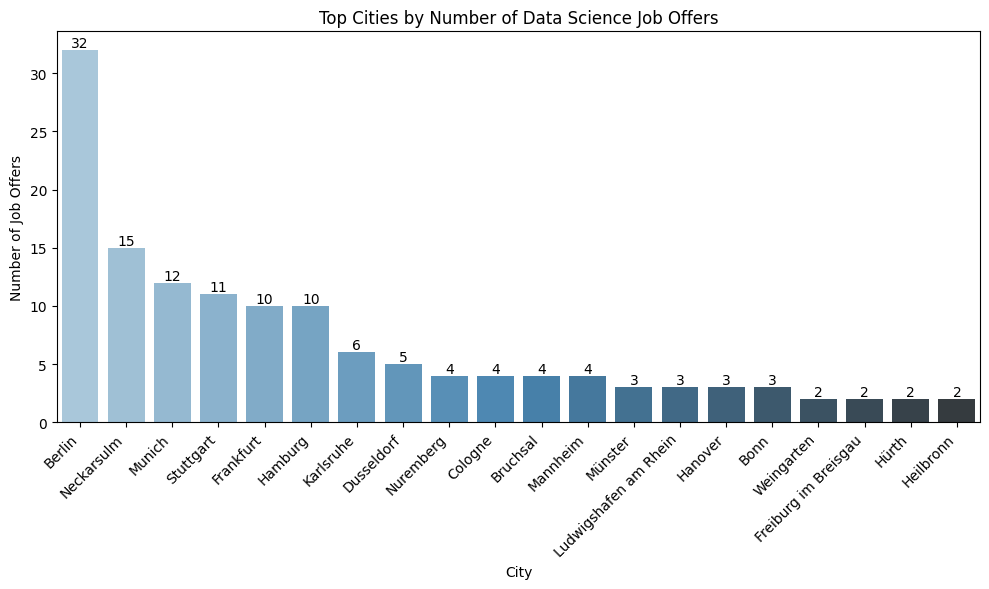 ## Top 20 Cities for Job Offerstop_cities = df_coords["city"].value_counts().head(20).reset_index() # get top 20top_cities.columns = ["city", "count"]plt.figure(figsize=(10, 6))ax = sns.barplot(data=top_cities, x="city", y="count", palette="Blues_d", hue="city", legend=False)# Add annotationsfor i, row in top_cities.iterrows(): ax.text(i, row["count"], str(row["count"]), ha='center', va='bottom', fontsize=10)plt.title("Top Cities by Number of Data Science Job Offers")plt.xticks(rotation=45, ha="right")plt.xlabel("City")plt.ylabel("Number of Job Offers")plt.tight_layout()plt.tight_layout()# ✅ Save BEFORE showplt.savefig(f"{output_dir}/top_cities.png", bbox_inches='tight')# show#plt.show()